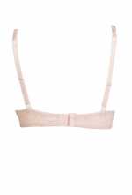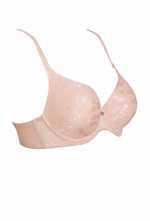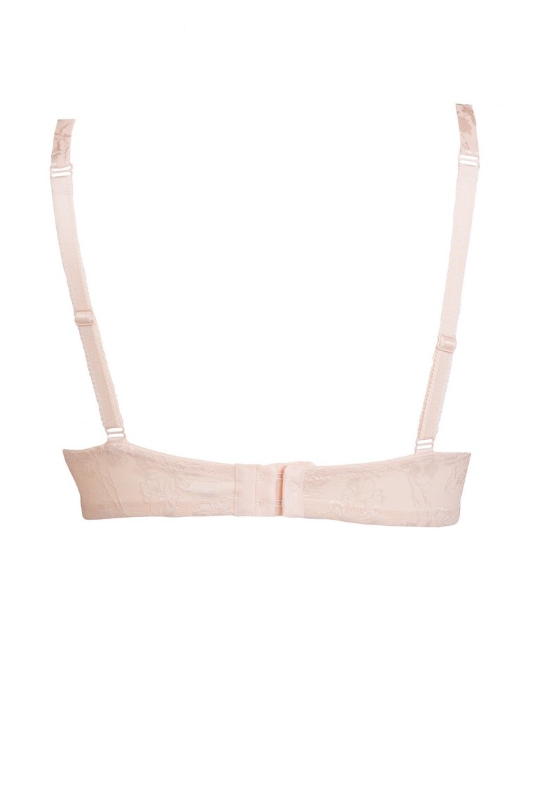 Biustonosz dwuwarstwowy na fiszbinach wykonany z elastycznej koronki z żakardowymi kwiatowymi motywami oraz satynowej warstwy wewnętrznej micro. Piankowe miseczki typu SUPER OIL PUSH UP, formowane bezszwowo, z silikonową wkładką modelującą. Idealnie kształtują i podpierają biust. Biustonosz typu T-shirt niewidoczny pod obcisłą odzieżą. Boczki z krytymi szwami z dodatkowym wzmacniającym panelem. Ramiączka z regulacją częściowo wykonane z koronki. Zapięcie z tyłu trzystopniowe.